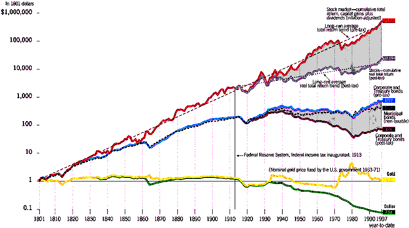 Prof. Jeremy J. Siegel of the Wharton School of Finance examined the historical performance of stocks and bonds in the US from 1802 to 1992 in his excellent book, Stocks for the Long Run: A Guide to Selecting Markets for Long-Term Growth (1994, Irwin Professional Publishing). This work, updated to 1997 27, demonstrated that the long-term rate of return for US equities, adjusted for inflation but not for taxes, was a relatively constant 6.6% during the entire period studied, although the market could under- or out-perform this base rate for periods as long as 20 years. The other asset classes examined were not even close. Long-term Performance By Asset Class: US 1801-1997 (from Forbes, 7/28/97).