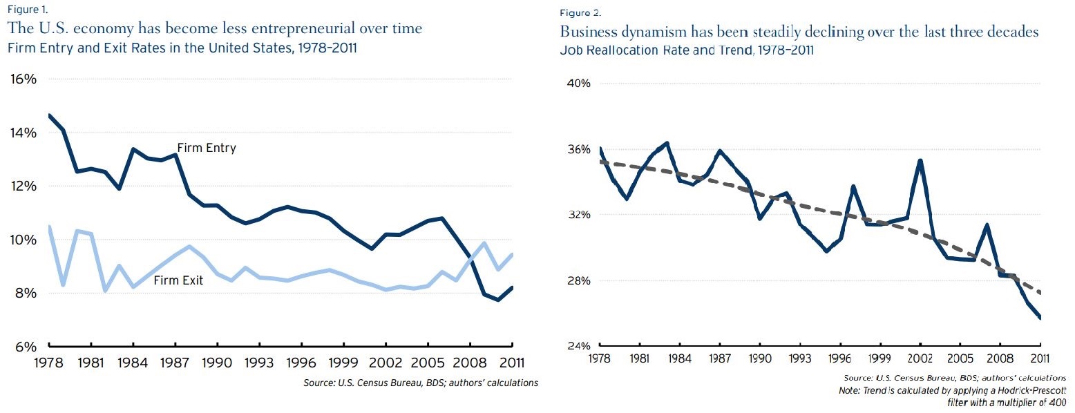 The decline in new business formation and business dynamism from 1978 to 2011:[8]